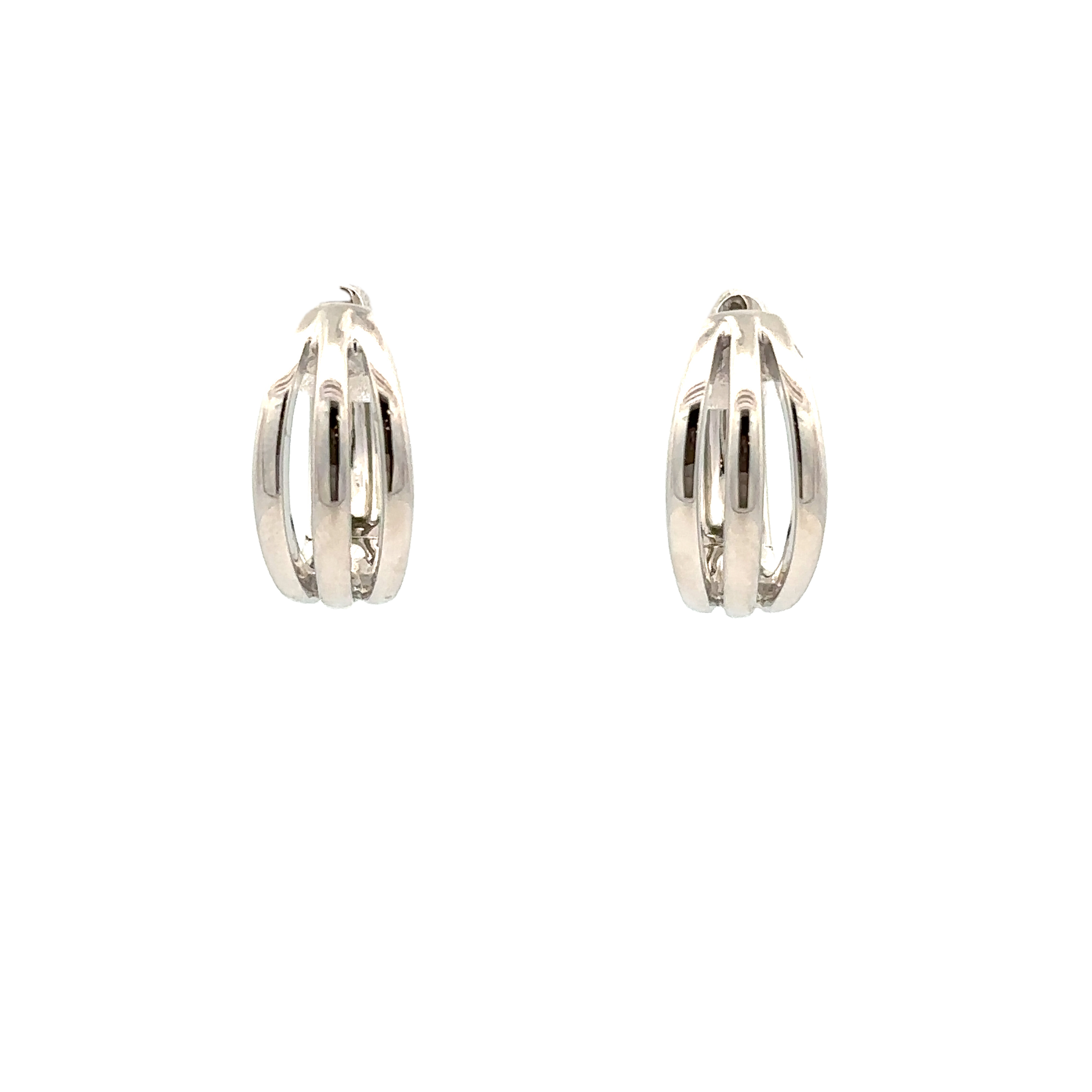 This is a triple line earring designed for women with a bold, confident attitude. It comes in 14k yellow gold, white gold or rose gold and features a front facing design. The earring is 15mm in long, 14mm high, and 7mm wide.